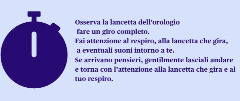 Una piccola pratica che possiamo a costo zero ogni giorno è questa: quando ci sentiamo sopraffatti o pieni di pensieri o bisognosi di “staccare un attimo la mente” possiamo portare l’attenzione sul nostro respiro – sull’aria che entra e che esce,- e osservare la lancetta dei secondi del nostro orologio.