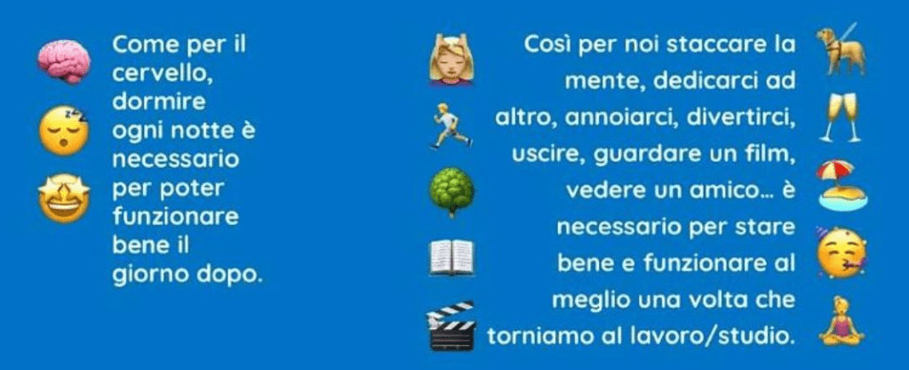 Come per il cervello, dormire ogni notte è necessario per poter funzionare bene il giorno dopo, così per noi staccare la mente, dedicarci ad altro, annoiarci, divertirci, uscire, guardare un film, vedere un amico… è necessario per stare bene e funzionare al meglio una volta che torniamo al lavoro/studio. Studiare dieci ore di seguito può essere utile per provare in extremis a superare un esame all’ultimo, ma studiare ogni giorni dieci ore di seguito a lungo andare non è una strategia molto vincente: ci si stanca, si perde motivazione, ci si chiude in una stanza da cui non sembra mai di uscire, si perdono contatti e il piacere di fare. Lo stesso può accadere con il lavoro. O ancora lo stesso può accadere se la nostra giornata è costituita di attività performanti una dietro l’altra senza mai un momento di pausa, di stacco o di piacere. Ma cosa possiamo fare? Le attività che ci rilassano, che ci ricaricano e che ci danno piacere sono diverse per ognuno di noi: c’è chi per esempio si rilassa sistemando qualche parte di casa o chi facendo due tiri a palla, chi ascoltando la musica meno rilassante del mondo e chi facendo yoga. E’ molto soggettivo: il punto è lasciarsi lo spazio per fare qualcosa di fine a se stesso, qualcosa che ci piace e che ci fa stare bene fare. Alcuni stimoli possono essere per esempio: