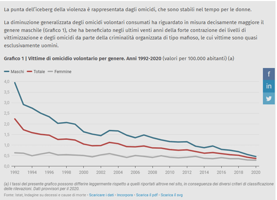 Un altro dato ISTAT importante riguarda il fatto che mentre gli omicidi di uomini sono diminuiti nell’ultimo ventennio – grazie al calo delle vittime di mafia e di terrorismo – i femminicidi risultano rimanere costanti nel tempo.